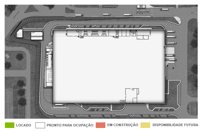| Módulos | Armazenagem (m²) | Mezanino (m²) | Adm. Térreo (m²) | Cobertura de docas (m²) | Vestiário (m²) | Área comum (m²) | Área Locável Total (m²) | Docas (un) | Pé-direito (m) | Piso (Ton/m²) |